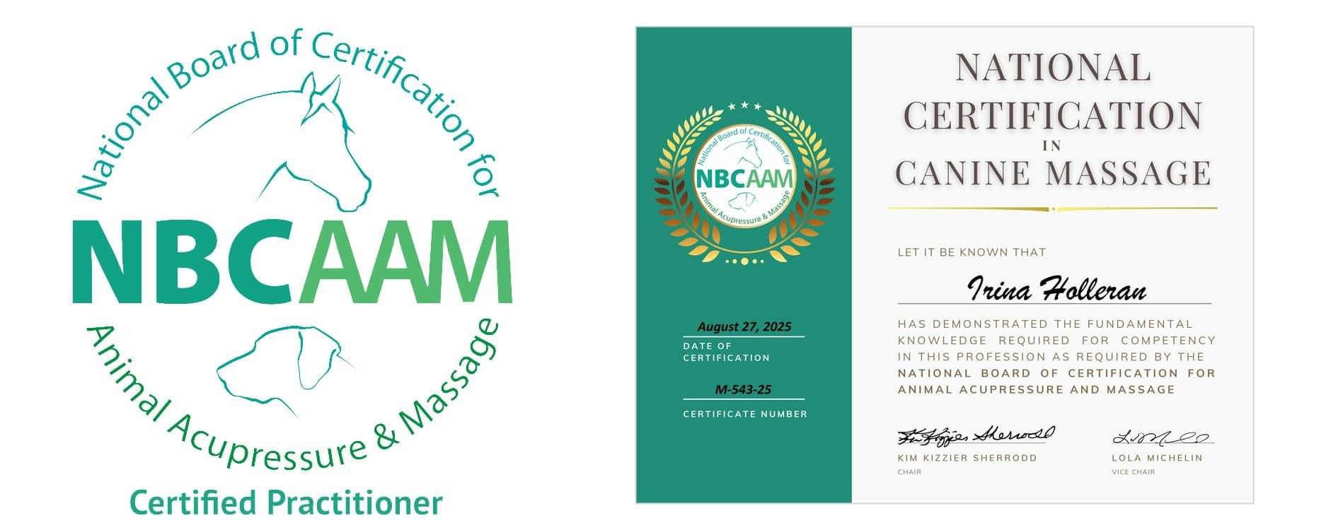 National Certification in Canine Massage by the National Board of Certification for Animal Acupressure and Massage (NBCAAM), the USA. 2025
